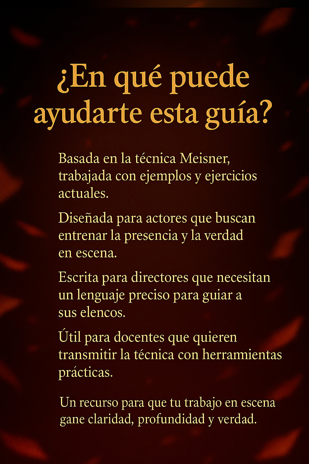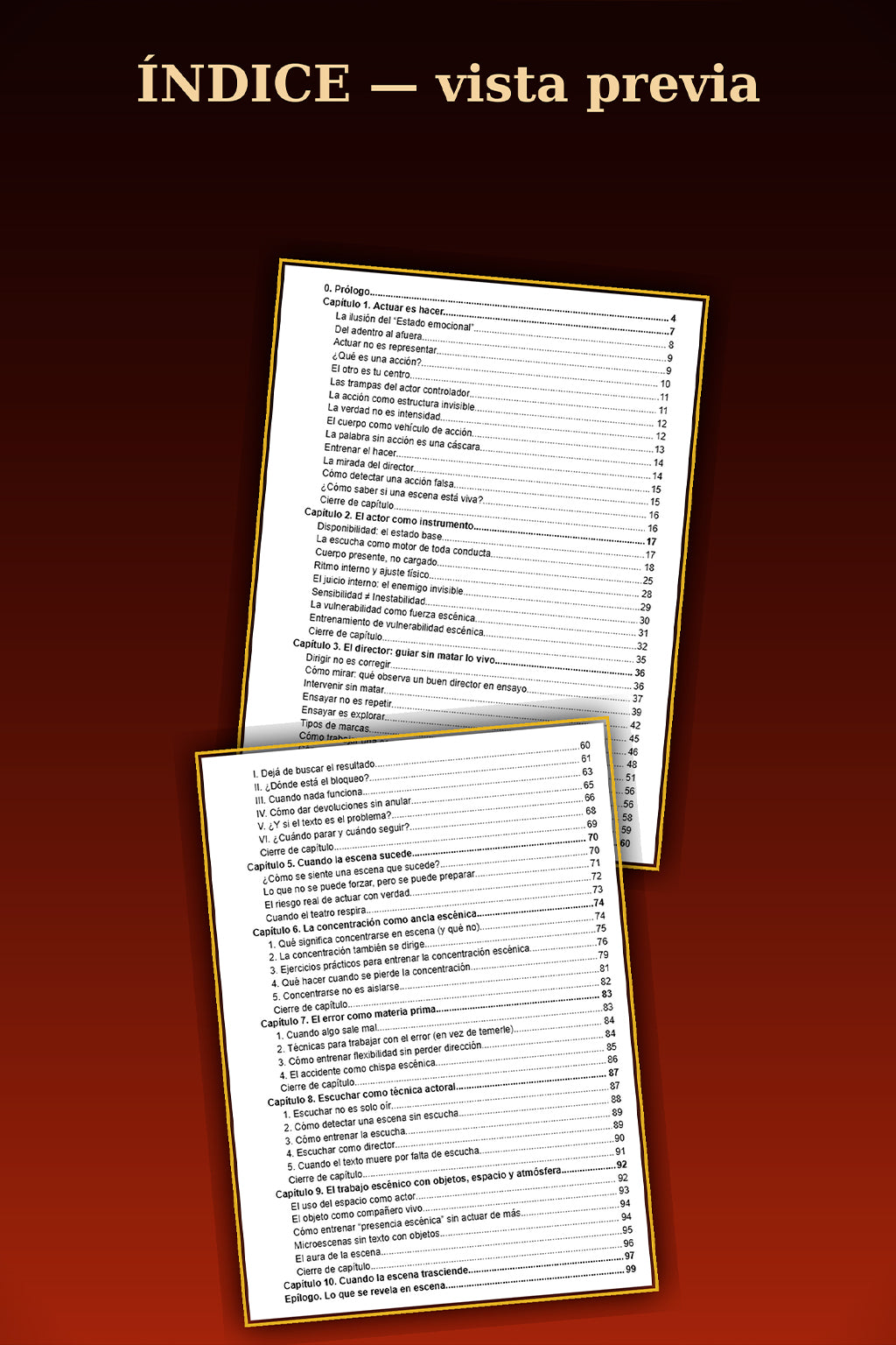 Un método práctico en formato PDF que te enseña a actuar y dirigir con verdad desde la acción real, la escucha viva y la dirección consciente. Basado en los principios de la técnica Meisner, adaptado a la práctica contemporánea del actor y del director.